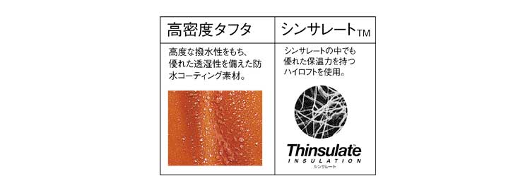中綿にシンサレートハイロフトを使用。高度な撥水性と透湿性に加え耐久摩擦撥水と目張り加工を施した、最高級のグレードを誇る防寒ウェアです。冬を制覇する透湿防水防寒。
