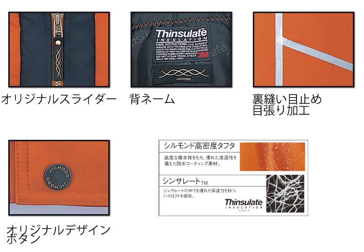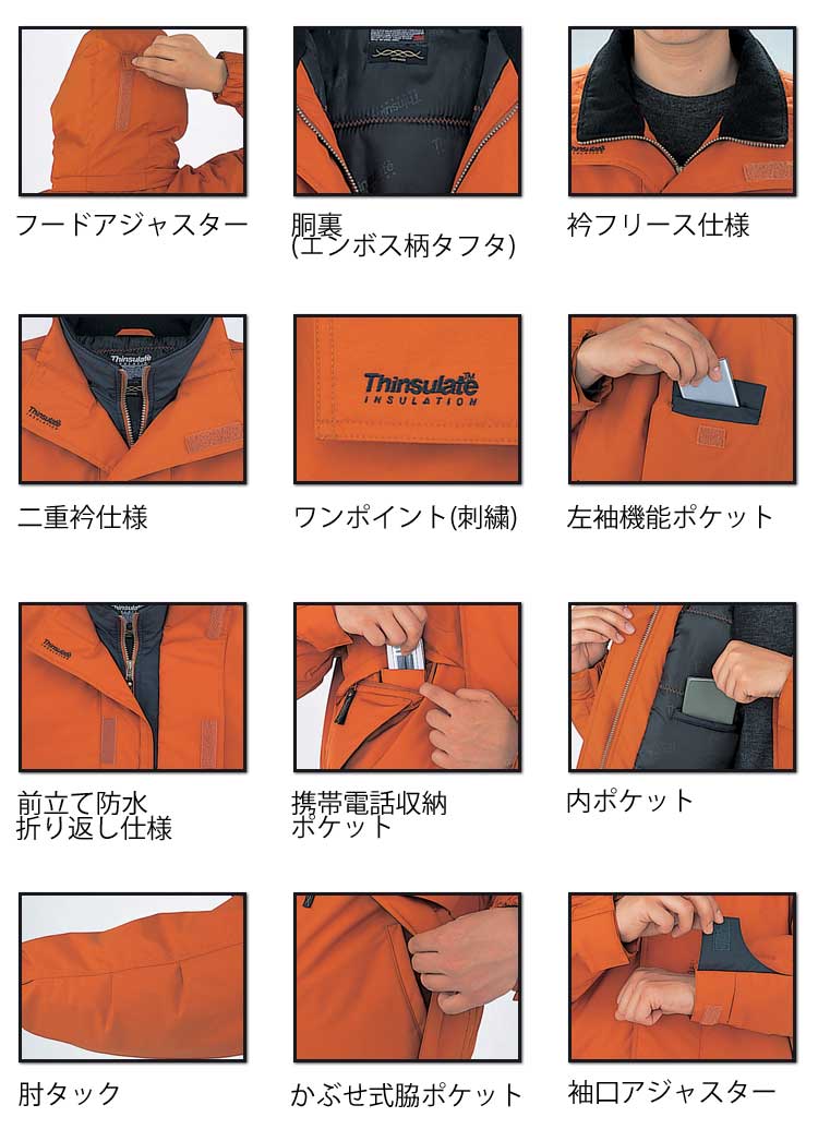 水と寒さに威力を発揮する透湿防水防寒。高い保温性と軽量化に加え、耐水圧2000mm、透湿度4000g/m2/24hの本格透湿防水防寒。極寒の環境下で働くワーカーのために中綿に「シンサレートハイロフト」を使用。