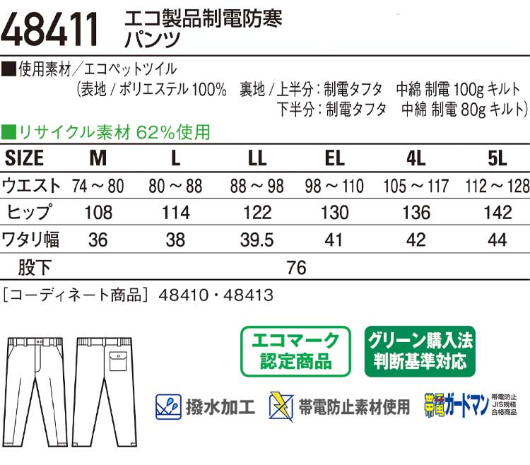 防寒着 防寒服 作業服 自重堂 エコ製品静電防寒パンツ 48411