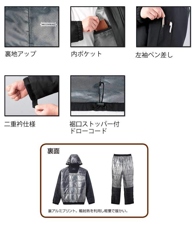 裏アルミプリントの防寒。輻射熱を利用した魔法瓶効果の軽量ながら暖かい防寒。