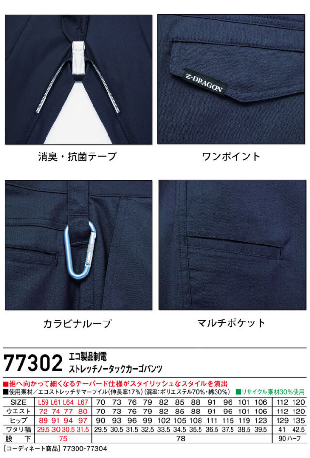 Z-DRAGONのエコ製品制電ストレッチノータックカーゴパンツです。SDGs(持続可能な開発目標)に沿った、再生糸を用いたECO作業服です。優れた帯電防止性を備えるJIS T8118適合帯電防止作業着、快適な着用感を追求した伸長率17%のストレッチサマーツイル素材を使用しています。裾へ向かって細くなるテーパード仕様でスタイリッシュなパンツです。男女ユニセックスの着用に対応しています。