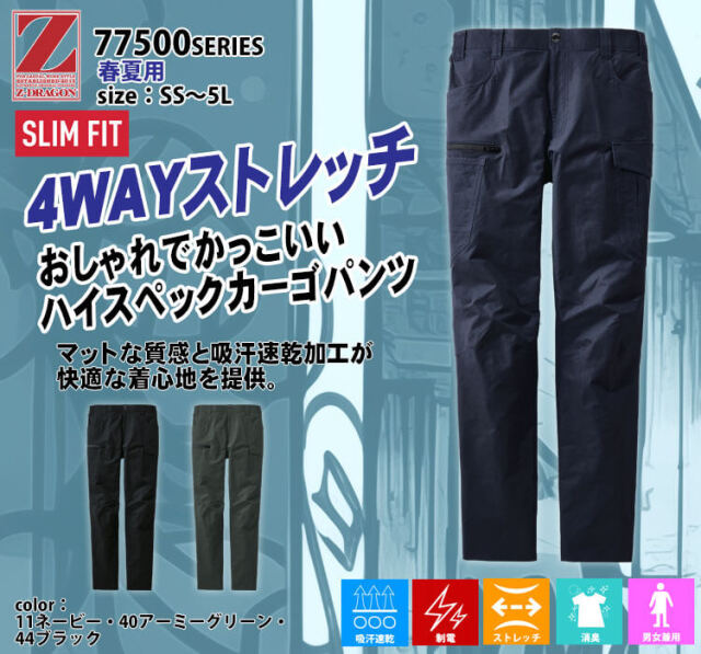 Z-DRAGONの製品制電ストレッチノータックカーゴパンツです。上下左右の4方向に自在に伸縮し、4WAYストレッチタフタを使用し、あらゆる動きに対応できる作業服です。マットな質感と吸汗速乾加工が快適な着心地です。JIS T-8118規格適合帯電防止服で、男女ユニセックスの着用が可能となっています。
