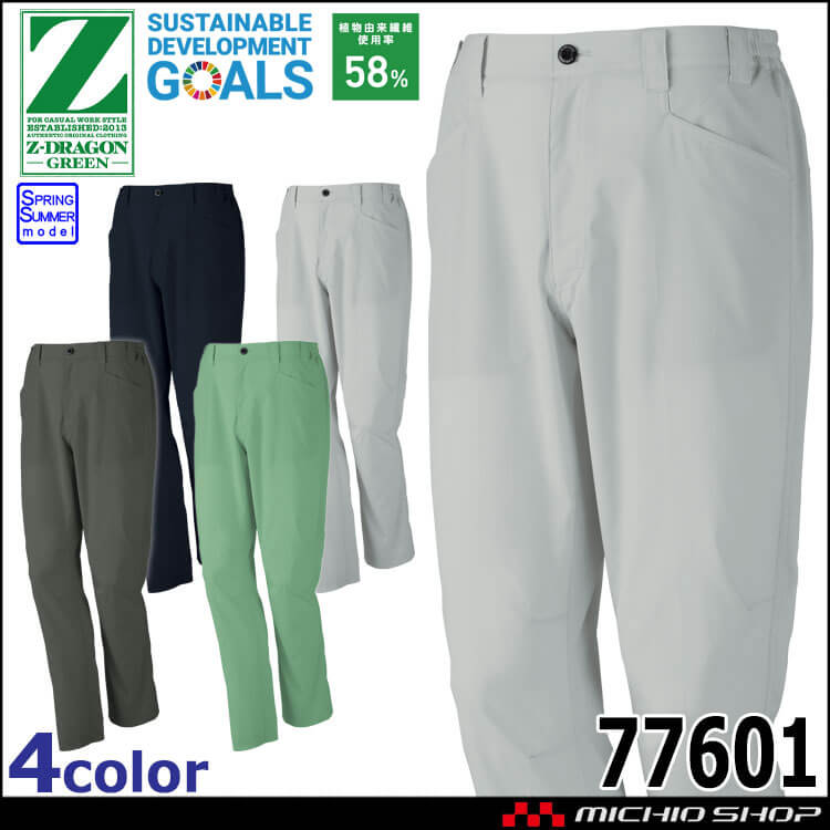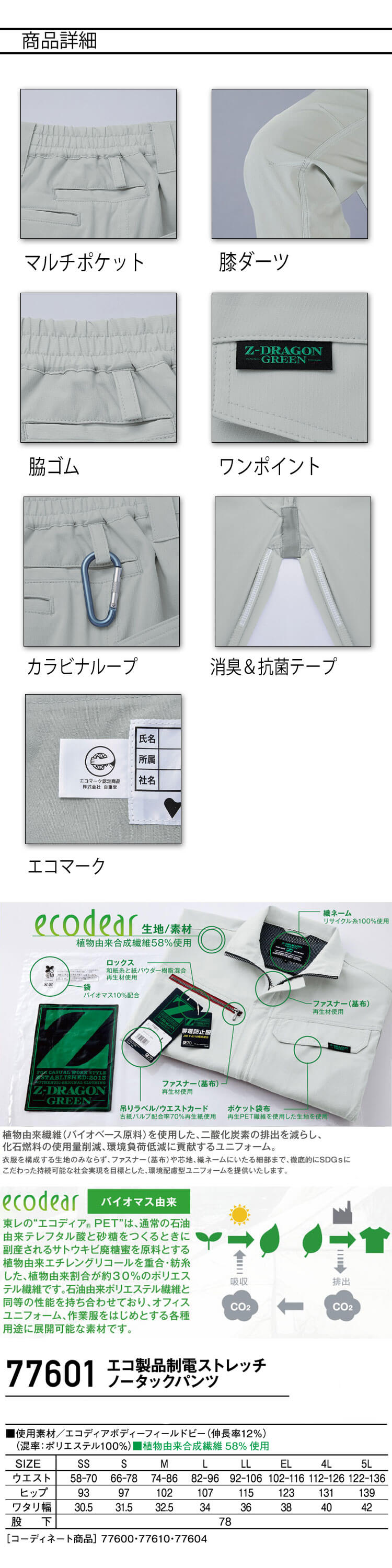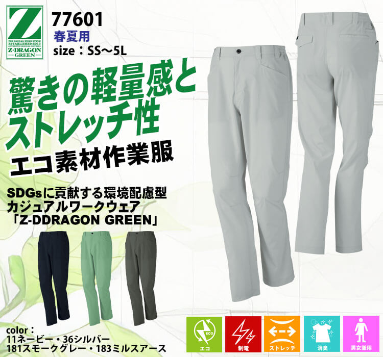 Z-DRAGONのエコ製品制電ストレッチノータックパンツです。SDGsに貢献する環境配慮型カジュアルワークウェア「Z-DRAGON GREEN」です。SDGsを考慮した植物由来繊維58%素材を使用し、エコマーク&グリーン購入法対応作業服です。表素材だけでなく付属にも環境配慮型素材を使用しています。驚きの軽量感とストレッチ機能で快適な着用感を実現しています。
