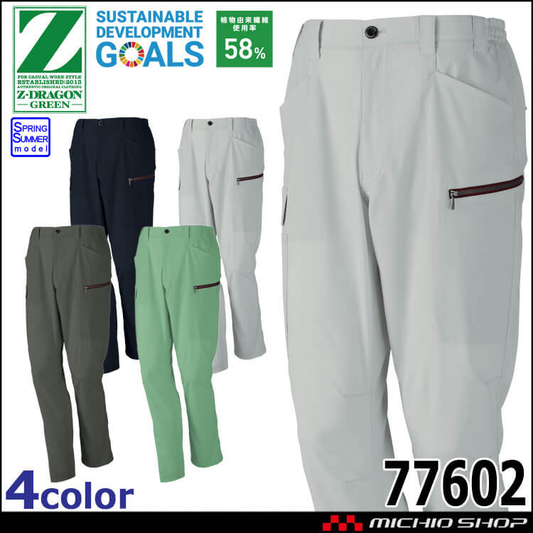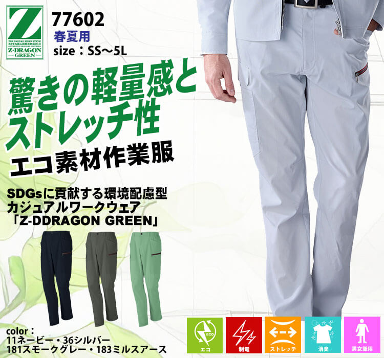 Z-DRAGONのエコ製品制電ストレッチノータックカーゴパンツです。SDGsに貢献する環境配慮型カジュアルワークウェア「Z-DRAGON GREEN」です。SDGsを考慮した植物由来繊維58%素材を使用し、エコマーク&グリーン購入法対応作業服です。表素材だけでなく付属にも環境配慮型素材を使用しています。驚きの軽量感とストレッチ機能で快適な着用感を実現しています。