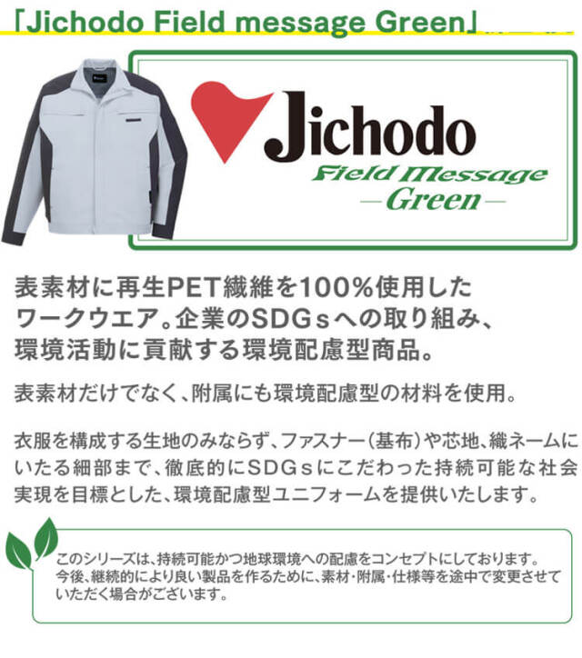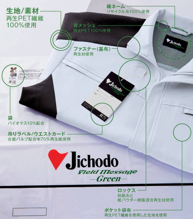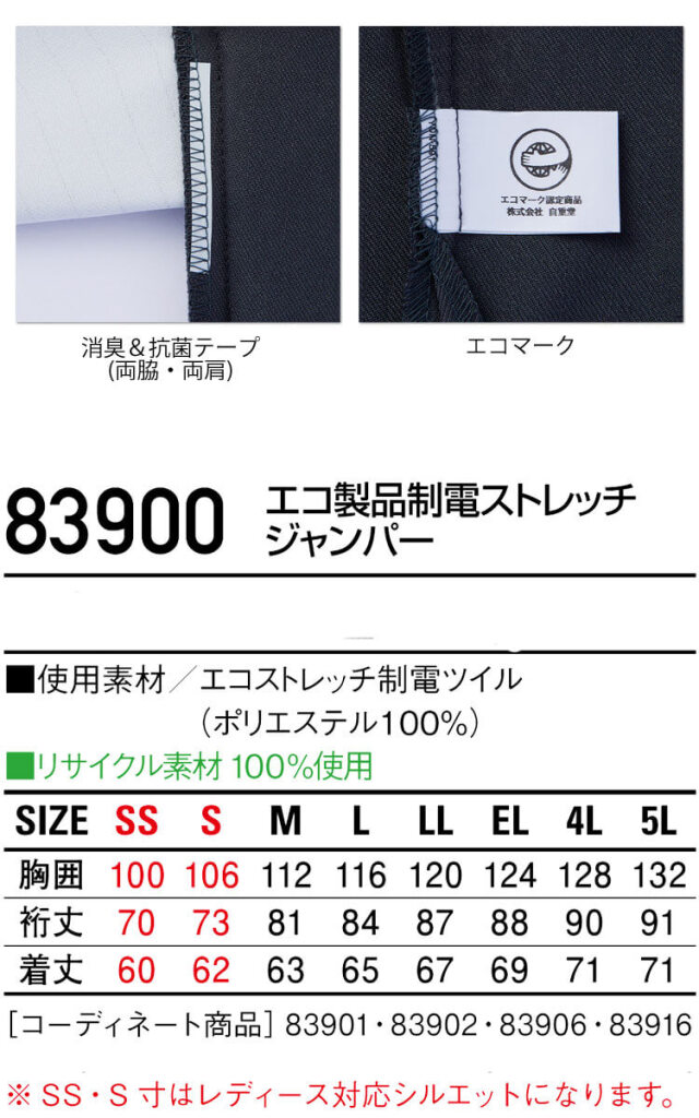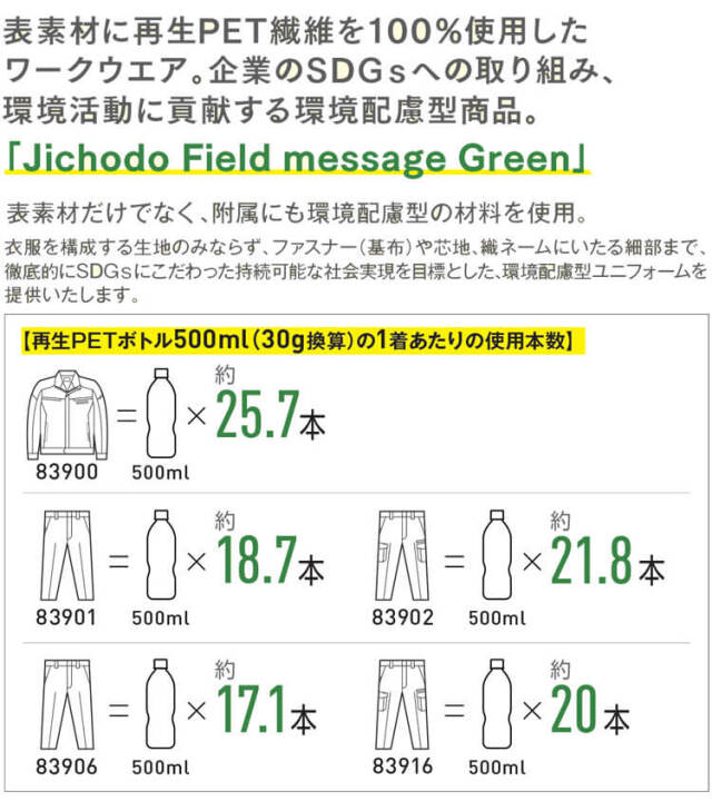 自重堂のSDGsに貢献する環境配慮型作業服83900シリーズです。表素材に再生PET繊維を100%使用したワークウェアです。企業のSDGsへの取り組み、環境活動に貢献する環境配慮型商品です。表素材だけでなく、附属にも環境配慮型の材料を使用、衣服を構成する生地のみならず、ファスナー(基布)や芯地、織ネームにいたる細部まで、徹底的にSDGsにこだわった持続可能な社会実現を目標とした、環境配慮型ユニフォームです。環境保全に役立つと認めた商品につけられる環境レベルのエコマーク認定商品になります。