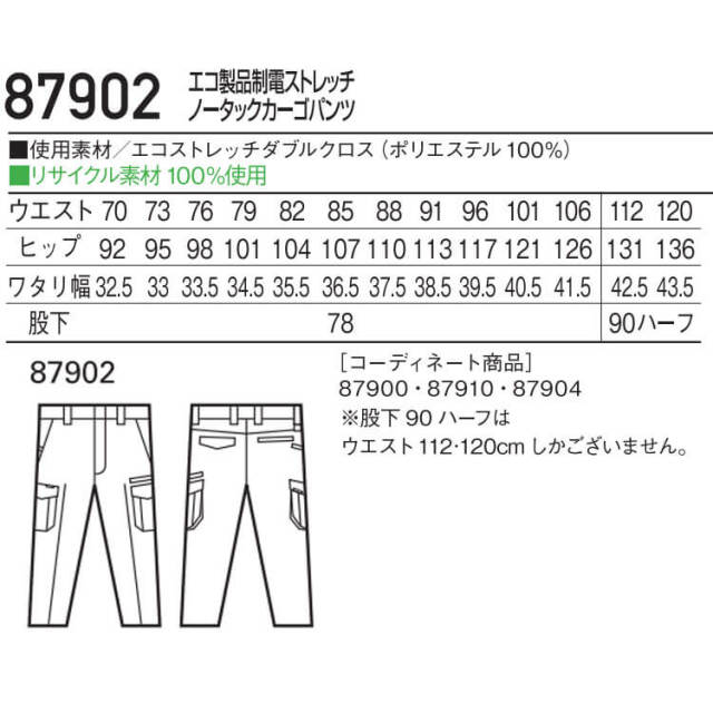 自重堂のSDGsに貢献する環境配慮型作業服87900シリーズです。表素材に再生PET繊維を100%使用したワークウェアです。企業のSDGsへの取り組み、環境活動に貢献する環境配慮型商品です。表素材だけでなく、附属にも環境配慮型の材料を使用、衣服を構成する生地のみならず、ファスナー(基布)や芯地、織ネームにいたる細部まで、徹底的にSDGsにこだわった持続可能な社会実現を目標とした、環境配慮型ユニフォームです。環境保全に役立つと認めた商品につけられる環境レベルのエコマーク認定商品になります。