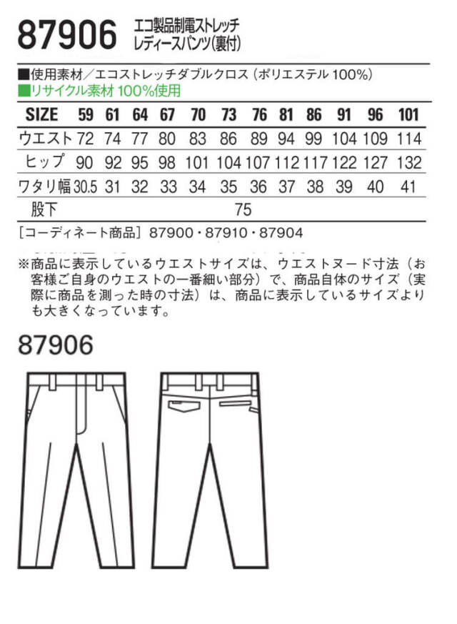 | 製品名: | エコ製品制電ストレッチレディースパンツ(裏付) |