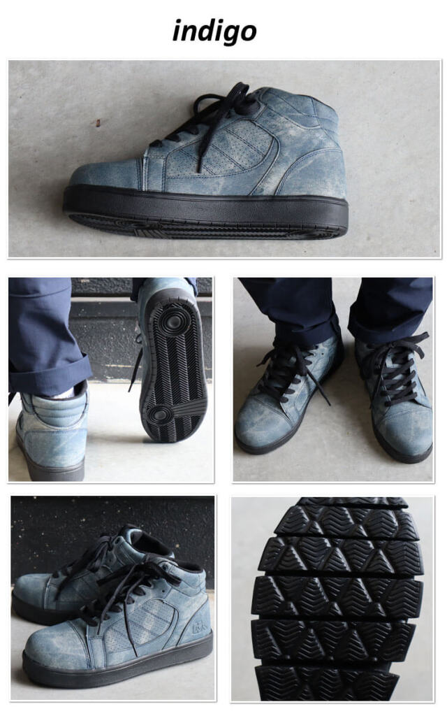 デニム風の素材を採用し、カジュアルな仕上がりのミッドカットデザイン。アッパーには撥水加工を施しているため、急な雨でも安心です。履き心地に優れるハニカム状のインソールを採用しました。足当たりの良さと蒸れにくいライニング素材。グリップ力に優れたアウトソールです。履き口に厚手のパッドを採用しており、踝まわりを保護します。
