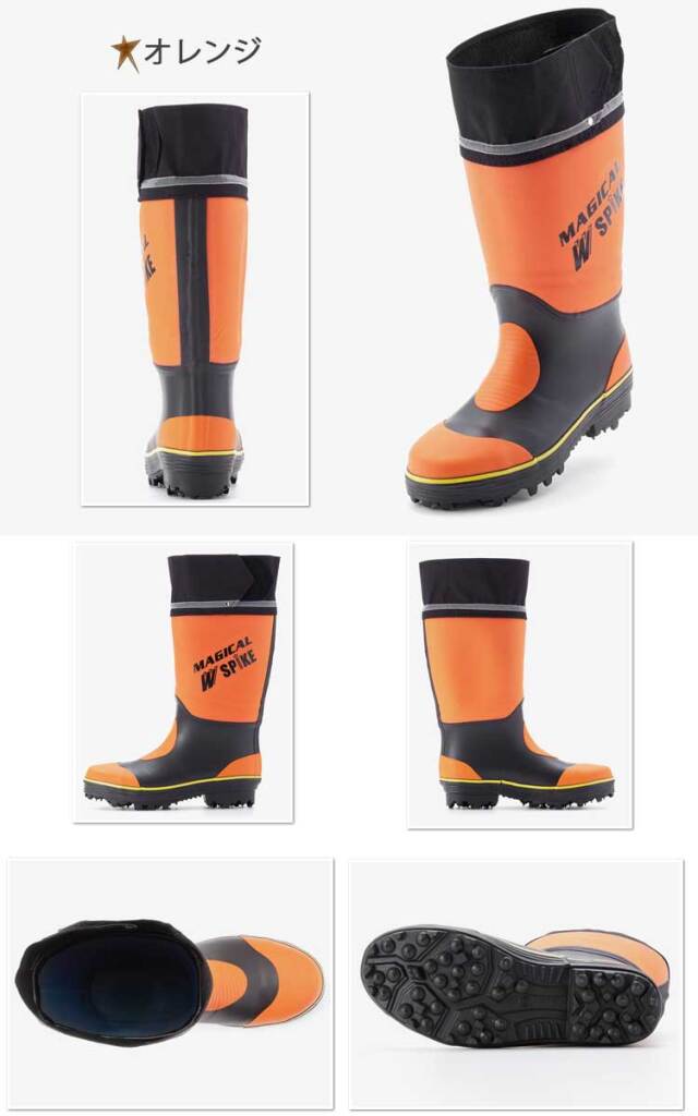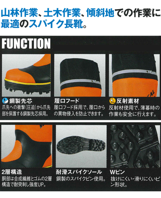 片足37本の鋼製ダブルスパイクピン仕様の胴太長靴。水や異物の侵入を防ぐフードとつま先を守る先芯入りタイプ。胴部は、合成繊維とゴムシートの二層構造になっていて耐突刺し強度を高めています。森林、土木作業・法面作業に最適です。