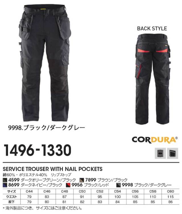 ヨーロッパのワークパンツの最大の特徴であるネイルポケット。腰から下がった左右のツールポケットやCORDURAで補強された膝当てが備わったBLAKLADERブランドのリップストップワークパンツ。膝当てのインナーポケットにCORDURAストレッチを使用しており快適な屈伸運動が可能です。内股・ふくらはぎのストレッチパネルやZIPポケット等、BLAKLADERブランドの最先端の技術が詰まったスタイルです。。膝当てには別売りの専用ニーパッドが装着可能です。リップストップソフトシェル(品番4950-2516)とのコーディネートが可能です。