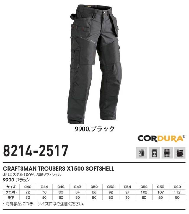BLAKLADERブラックラダーブランドのウィンドプルーフ防風ストレッチソフトシェルパンツです。高い透湿性と撥水性のある防風素材に裏地はフリースを使用しています。ヨーロッパのワークパンツの最大の特徴であるネイルポケット※腰から下がった左右のツールポケットやCORDU-RAで補強された膝当て等のデザインと防風性能を兼ね備えたハイスペックワークパンツです。対応ジャケットは品番4949-2517です。