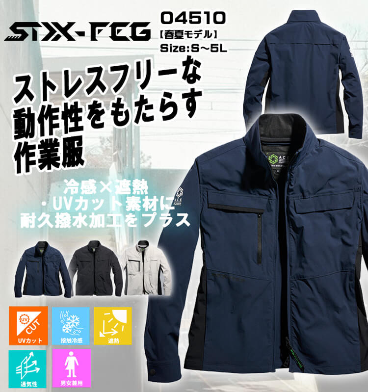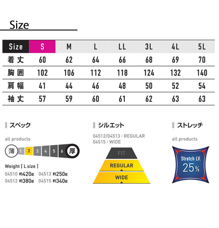 マットな風合いの4WAYストレッチナイロンをベースに通気性に配慮したベンチレーション等の機能をアーバンテイストデザインとスマートに融合させたスポーティワークモデル。ストレスフリーな動作性をもたらす4WAYストレッチ。ベンチレーション・保冷剤ポケットで熱中症対策に配慮。冷感×遮熱・UVカット素材に耐久撥水加工をプラス。
