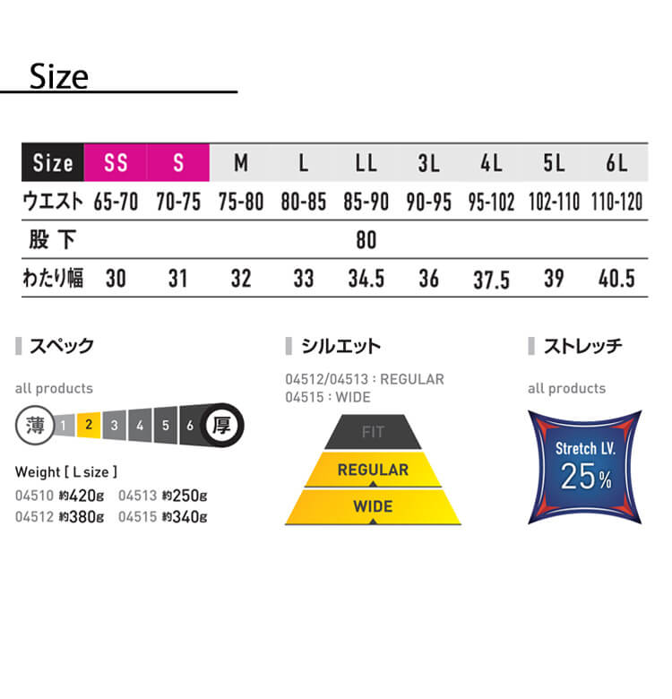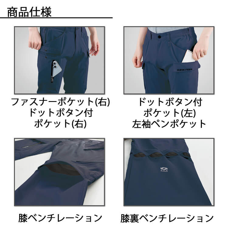 マットな風合いの4WAYストレッチナイロンをベースに通気性に配慮したベンチレーション等の機能をアーバンテイストデザインとスマートに融合させたスポーティワークモデル。ストレスフリーな動作性をもたらす4WAYストレッチ。ベンチレーション・保冷剤ポケットで熱中症対策に配慮。冷感×遮熱・UVカット素材に耐久撥水加工をプラス。