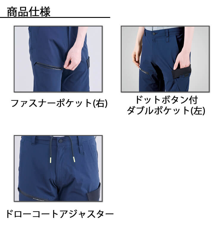 マットな風合いの4WAYストレッチナイロンをベースに通気性に配慮したベンチレーション等の機能をアーバンテイストデザインとスマートに融合させたスポーティワークモデル。ストレスフリーな動作性をもたらす4WAYストレッチ。ベンチレーション・保冷剤ポケットで熱中症対策に配慮。冷感×遮熱・UVカット素材に耐久撥水加工をプラス。