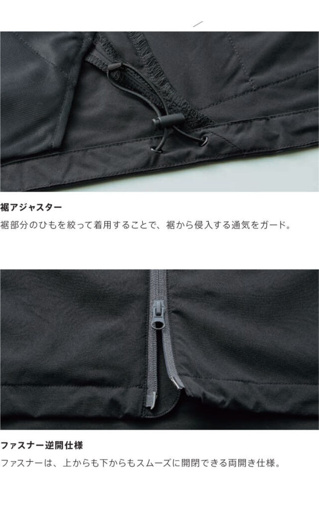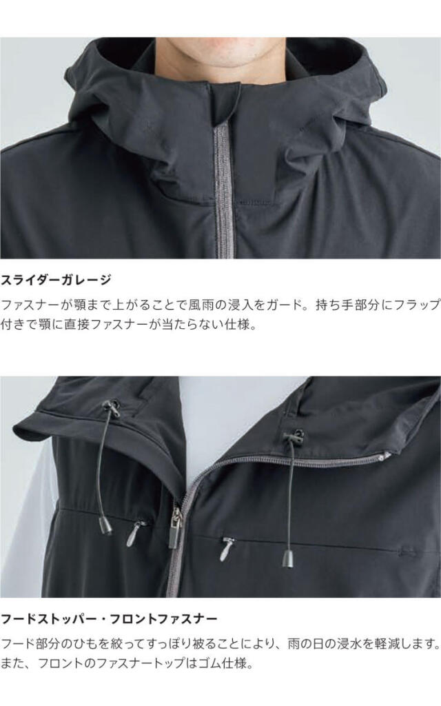 フードブルゾンと同等の機能を持たせながら、ベストならではの軽快さを実現。充実の収納性・通気性・防風機能を確保し、アクティブシーンをサポート。