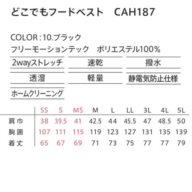 キャリーン CAREAN どこでもフードベスト(ユニセックス) CAH187 作業着 ベスト 通年 撥水 軽量