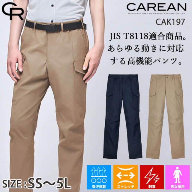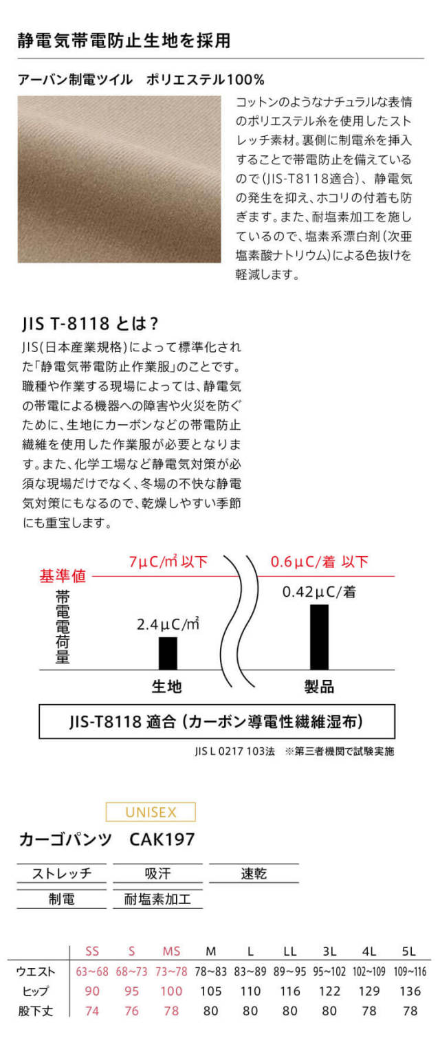 膝と股下に立体設計を取り入れた、あらゆる動きに対応する高機能パンツです。デザイン性の高いスマートなカーゴポケットが収納力も確保します。クールなビジュアルと快適性を叶える帯電防止の高機能ウェアです。着心地や動きやすさを追求した素材とパターン設計です。ビルメンテナンスなどのワークシーンに不可欠な機能を詰め込んで、スタイリッシュなデザインに落とし込んだ、JIS-T8118 適合の静電気帯電防止ウェアです。コットンのようなナチュラルな表情のポリエステル糸を使用したストレッチ素材です。裏側に制電糸を挿入することで帯電防止を備えているので(JIS-T8118適合)、 静電気の発生を抑え、ホコリの付着も防ぎます。また、耐塩素加工を施しているので、塩素系漂白剤(次亜塩素酸ナトリウム)による色抜けを軽減します。JIS T8118適合商品。電気や精密機器関係の職種の方にぴったりの機能を備えています。