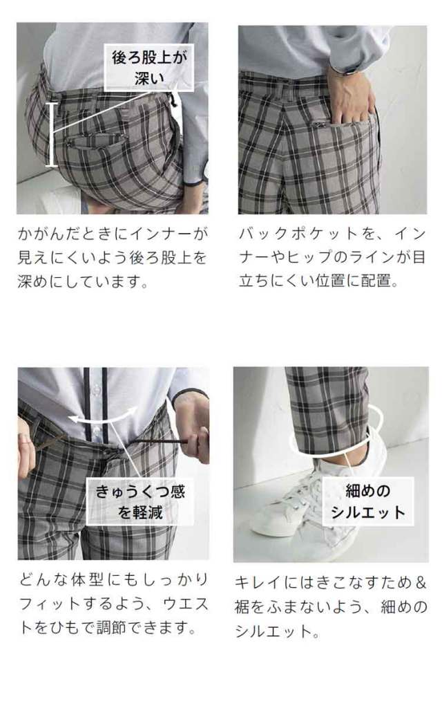 ・かがんだときにインナーが見えにくいような後ろ股上を深めにしています。
