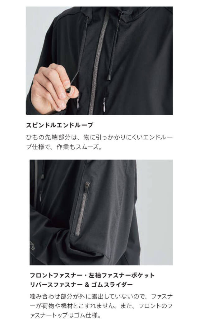 スタイリッシュに風を遮り、ハード環境にも対応したフード付長袖ブルゾン。スタイリッシュなスタイルが小粋に決まる、多機能フードブルゾン。風雨など過酷なワーク環境に対応し、作業効率を高める機能を搭載しました。