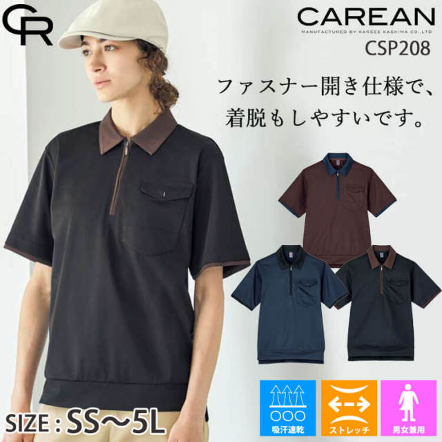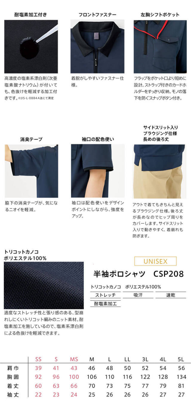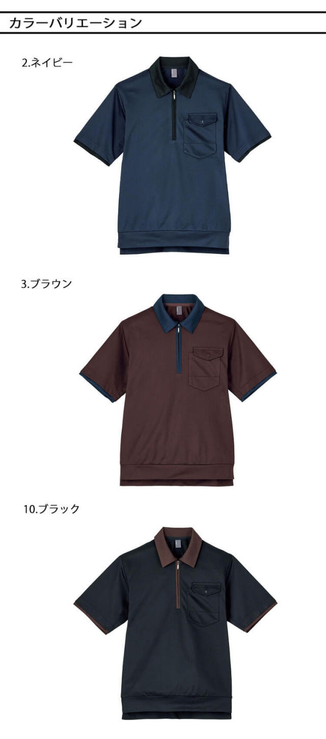 ファスナータイプで着脱がしやすい、衿元や袖口のさりげない配色使いがアクセントの洗練ポロです。後ろ丈が長めなのでヒップ周りをカバーします。サイドスリット入りで動きやすく、着崩れも防ぎます。適度なストレッチ性と張り感のある、型崩れしにくいトリコット編みのニット素材です。耐塩素加工を施しているので、塩素系漂白剤による色抜けを軽減できます。