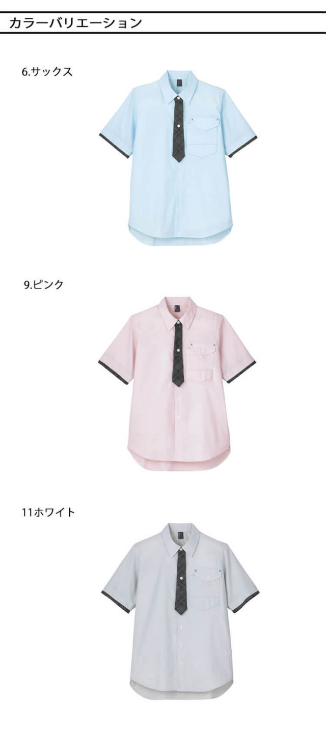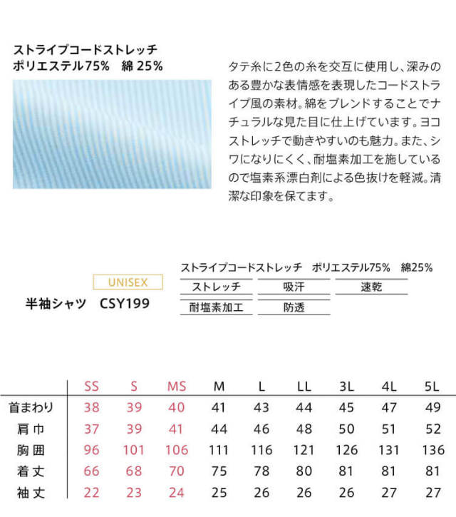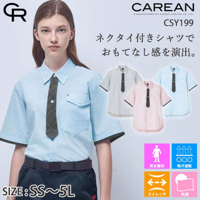 ネクタイをつけているかのようなデザインで、おもてなし感を演出します。堅苦しさを感じさせない、ほどよくフォーマルな印象のきちんと見えシャツです。タテ糸に2色の糸を交互に使用し、深みの ある豊かな表情感を表現したコードストライプ風の素材です。綿をブレンドすることでナチュラルな見た目に仕上げています。ヨコストレッチで動きやすいのも魅力です。また、シワになりにくく、耐塩素加工を施しているので塩素系漂白剤による色抜けを軽減します。清潔な印象を保てます。フォーマルなディテールを取り入れた高機能おもてなしシャツです。きちんと感と着心地のよさを兼ね備えたCAREAN のシャツコレクションです。クリーンスタッフに最適な機能を充実させつつ、フォーマルな要素を取り入れた、おもてなしにふさわしいラインアップです。