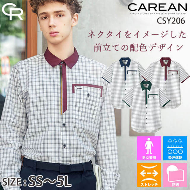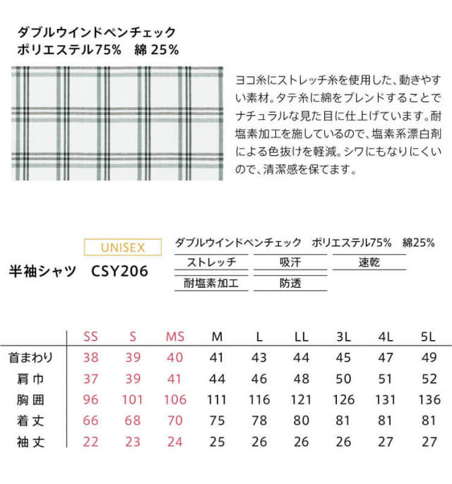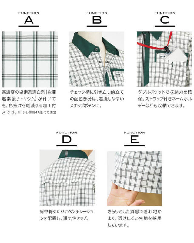 親しみやすいチェック柄に、ネクタイをイメージしたシックなカラー配色できちんと感をプラスしました。大容量のダブル胸ポケットや着脱しやすいスナップボタンなど、機能性も充実しています。ヨコ糸にストレッチ糸を使用した、動きやすい素材です。タテ糸に綿をブレンドすることでナチュラルな見た目に仕上げています。耐塩素加工を施しているので、塩素系漂白剤による色抜けを軽減します。シワにもなりにくいので、清潔感を保てます。