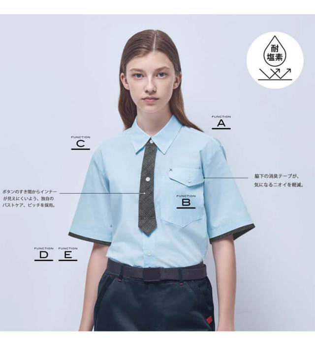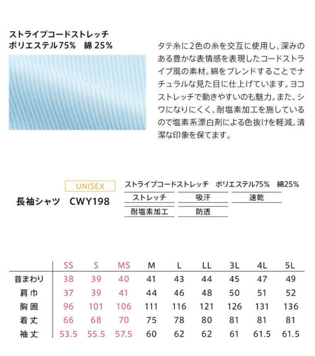 ネクタイをつけているかのようなデザインで、おもてなし感を演出します。堅苦しさを感じさせない、ほどよくフォーマルな印象のきちんと見えシャツです。タテ糸に2色の糸を交互に使用し、深みの ある豊かな表情感を表現したコードストライプ風の素材です。綿をブレンドすることでナチュラルな見た目に仕上げています。ヨコストレッチで動きやすいのも魅力です。また、シワになりにくく、耐塩素加工を施しているので塩素系漂白剤による色抜けを軽減します。清潔な印象を保てます。フォーマルなディテールを取り入れた高機能おもてなしシャツです。きちんと感と着心地のよさを兼ね備えたCAREAN のシャツコレクションです。クリーンスタッフに最適な機能を充実させつつ、フォーマルな要素を取り入れた、おもてなしにふさわしいラインアップです。