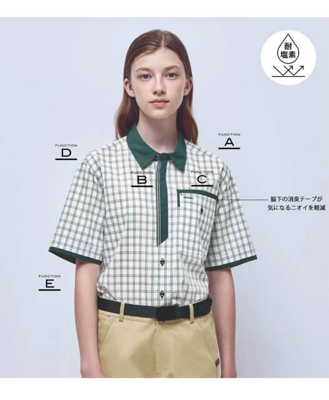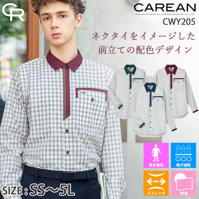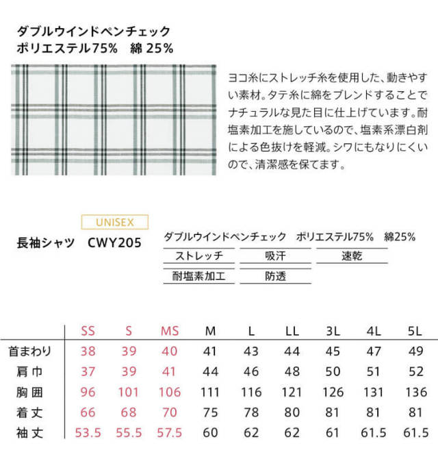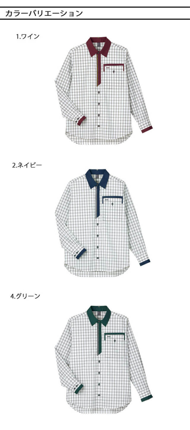 親しみやすいチェック柄に、ネクタイをイメージしたシックなカラー配色できちんと感をプラスしました。大容量のダブル胸ポケットや着脱しやすいスナップボタンなど、機能性も充実しています。ヨコ糸にストレッチ糸を使用した、動きやすい素材です。タテ糸に綿をブレンドすることでナチュラルな見た目に仕上げています。耐塩素加工を施しているので、塩素系漂白剤による色抜けを軽減します。シワにもなりにくいので、清潔感を保てます。