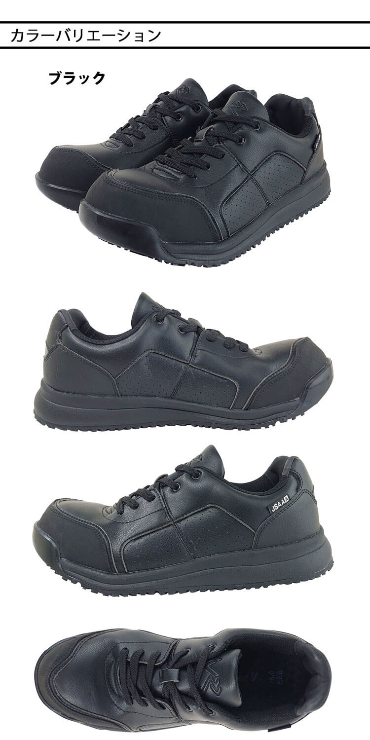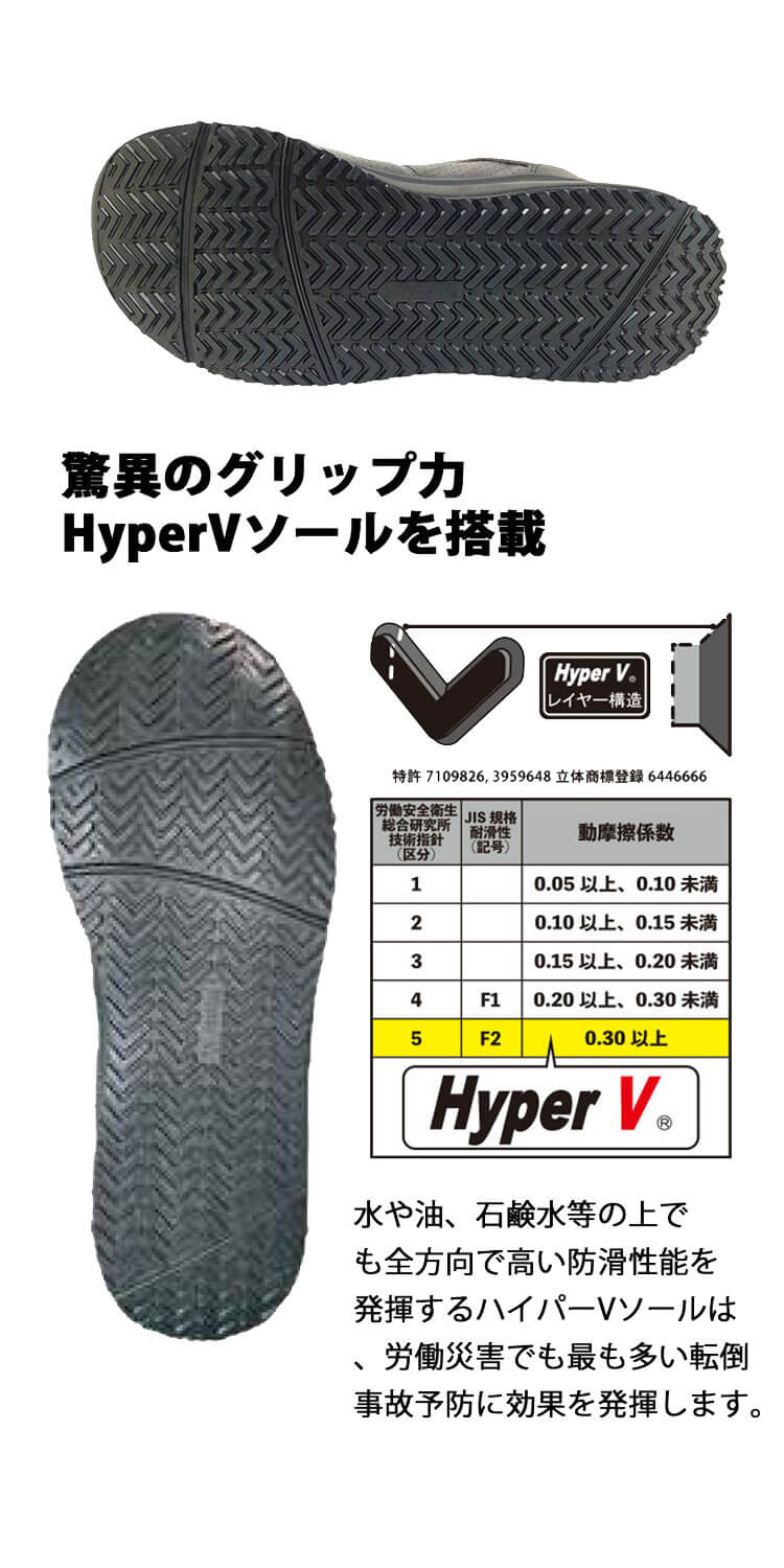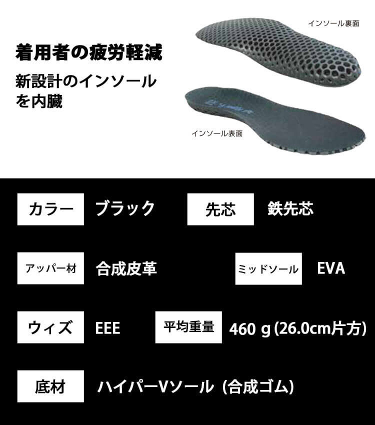 耐油・耐滑・クッション性に優れたHyperVソールを搭載した合皮仕様のプロスニーカーです。 水や油などで滑りやすい現場でも高い耐滑性能を発揮し、安定した足元で作業をサポートします。 インソールにはハニカム構造のEVA素材を採用し、クッション性を向上。 さらに足にフィットする立体構造設計により、長時間の作業でも快適な履き心地が続きます。 JSAA規格A種適合の安心設計で、耐衝撃・耐圧迫性能を備えたプロ仕様モデル。 加えて、分割された肉羽根構造が開閉することで甲の高さを問わずしっかりフィットし、さまざまな足型に対応します。 安全性と快適性、フィット感を兼ね備え、幅広い作業現場で活躍する一足です。
