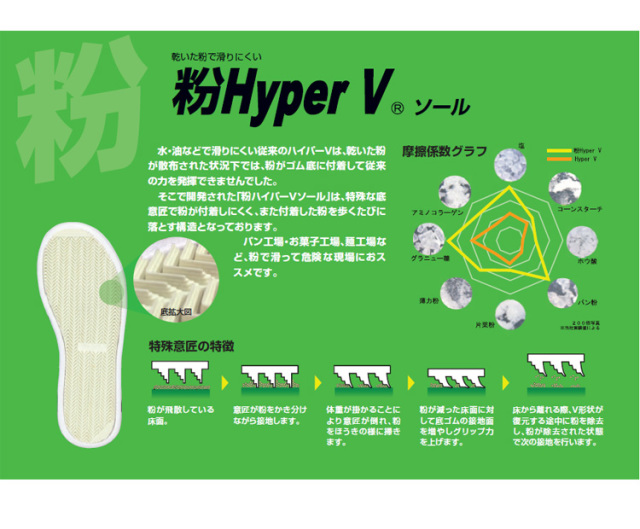 耐油・耐滑・クッション性に優れた粉HyperVソール搭載の粉用厨房シューズ。高い耐滑性能があり水や油など滑りやすい場所での作業で効果を発揮。