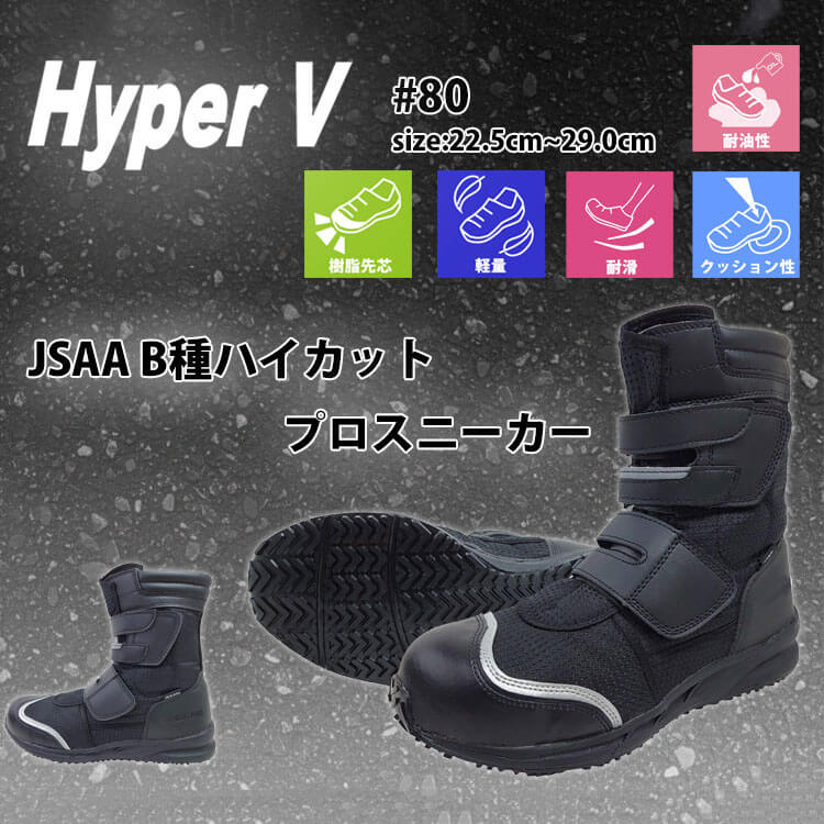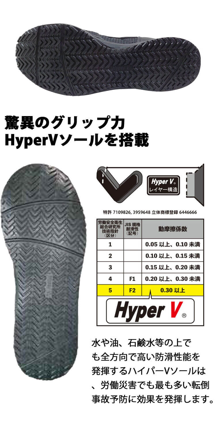 耐油・耐滑・クッション性に優れたHyperVソールを搭載したハイカットタイプのプロスニーカーです。優れた耐滑性能により、水や油などで滑りやすい現場でも安定した足元を確保し、安全な作業をサポートします。 ハイカット設計で足首までしっかり固定し、ホールド感を高めて安定性を向上。さらに軽量設計により、長時間の作業でも負担を軽減し、快適な履き心地を実現します。 安全性と動きやすさを兼ね備え、幅広い作業現場に適した一足です。
