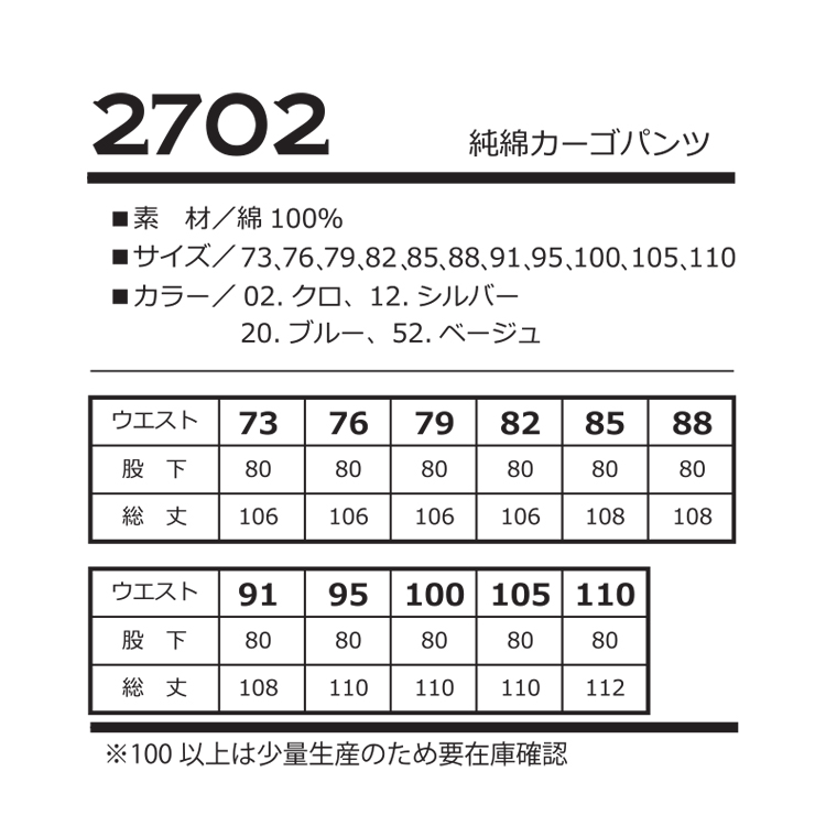 作業着 作業服 NBトラスト 純綿カーゴパンツ 2702
