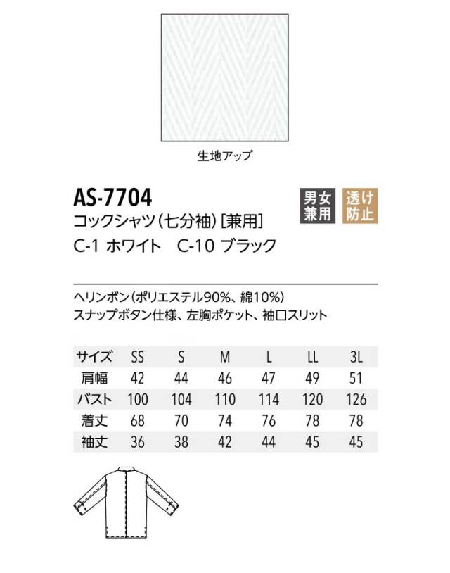 飲食サービス系ユニフォーム アルベ arbe チトセ chitose 兼用 コックシャツ(七分袖) AS-7704 通年