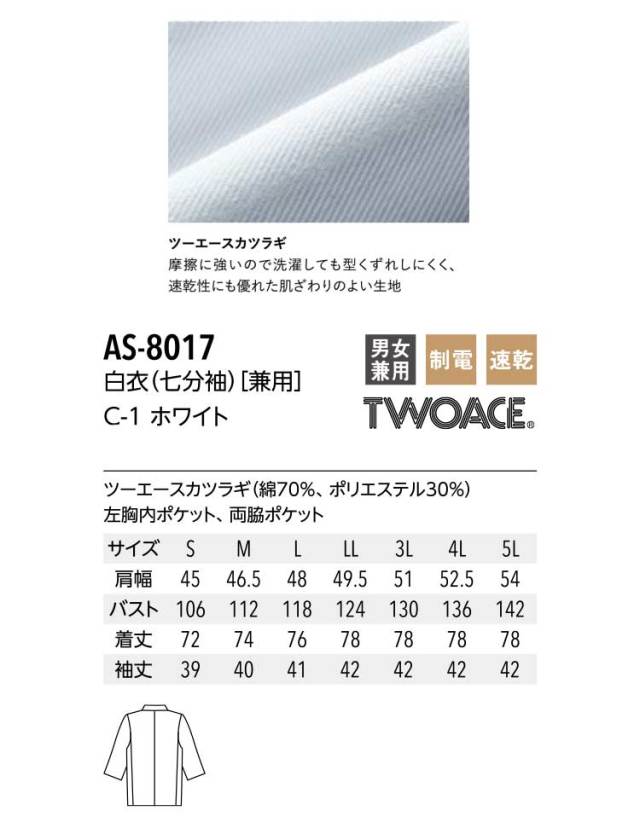 飲食サービス系ユニフォーム アルベ arbe チトセ chitose 兼用 白衣(七分袖) AS-8017 通年