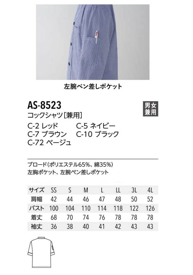 飲食サービス系ユニフォーム アルベ arbe チトセ chitose 兼用 コックシャツ AS-8523 通年