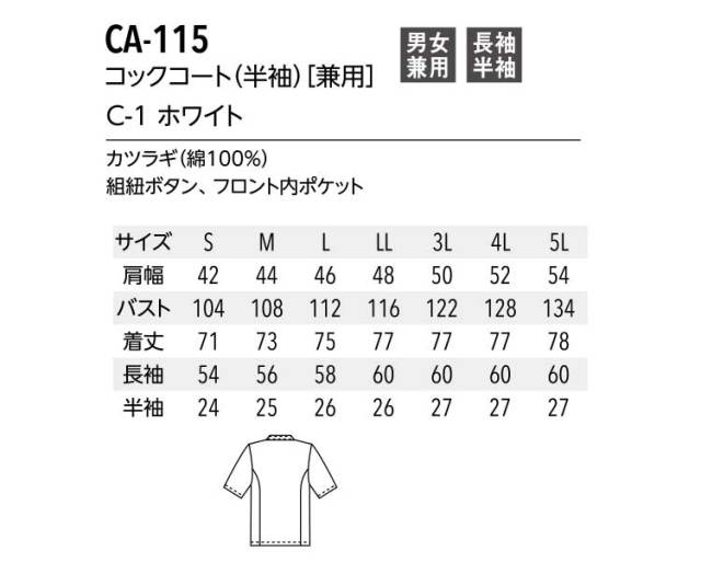 飲食サービス系ユニフォーム アルベ arbe チトセ chitose 兼用 コックコート(半袖) CA-115 通年