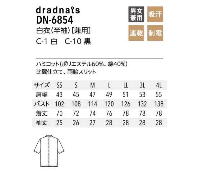 飲食サービス系ユニフォーム アルベ arbe チトセ chitose 兼用 白衣(半袖) DN-6854 通年