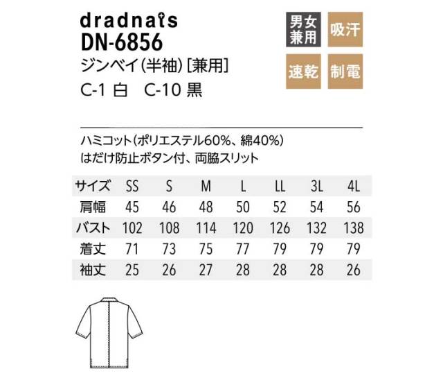 飲食サービス系ユニフォーム アルベ arbe チトセ chitose 兼用 白衣(半袖) DN-6854 通年