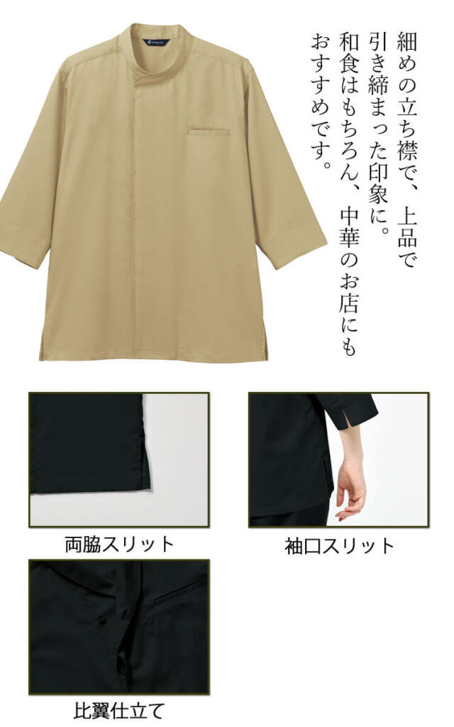 細めの立ち襟で、上品で引き締まった印象に。和食はもちろん、中華のお店にもおすすめです。