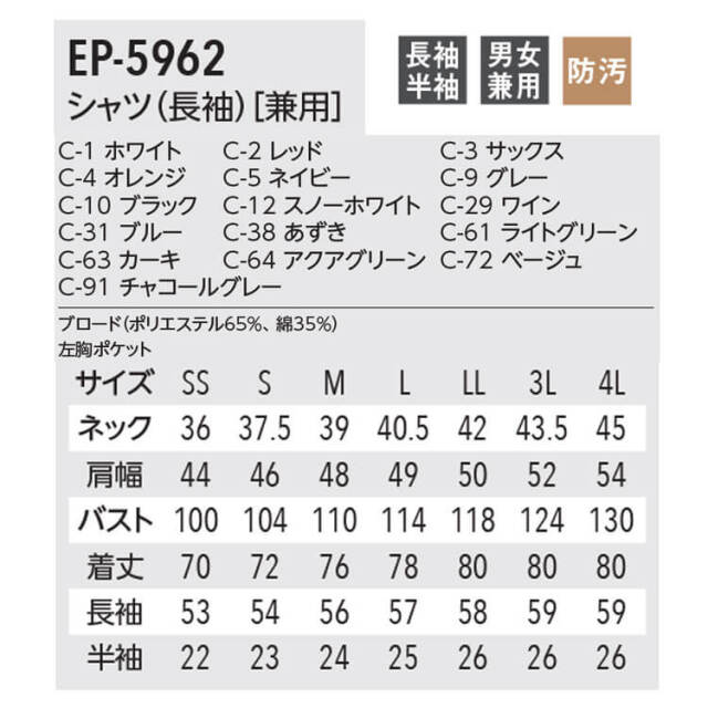 飲食サービス系ユニフォーム アルベ arbe チトセ chitose 兼用 長袖シャツ EP-5962 通年