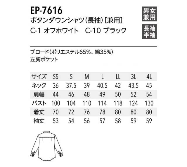 飲食サービス系ユニフォーム アルベ arbe チトセ chitose 兼用 長袖ボタンダウンシャツ EP-7616 通年