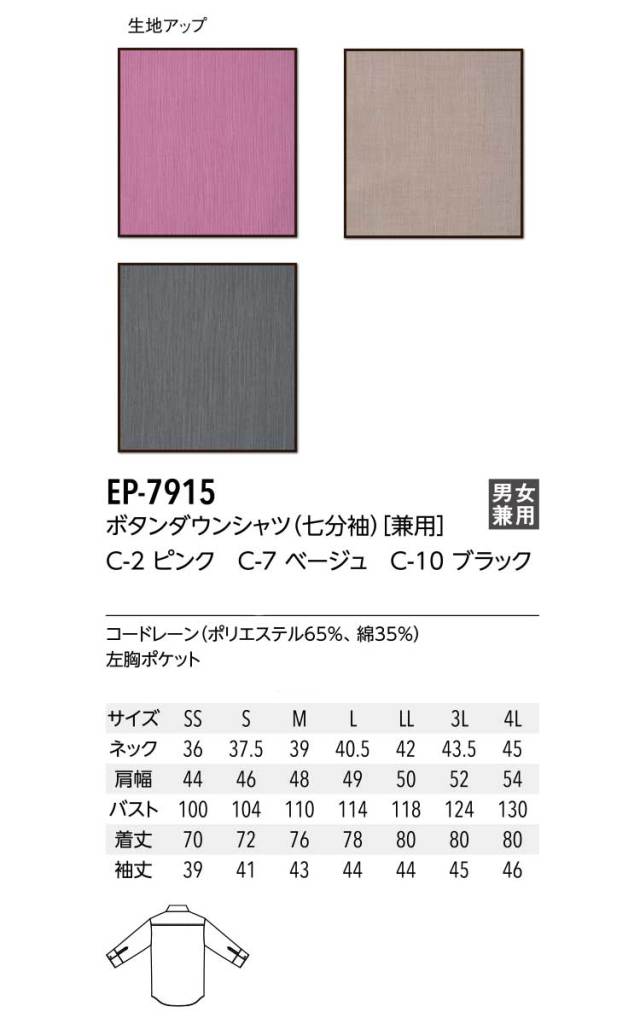 飲食サービス系ユニフォーム アルベ arbe チトセ chitose 兼用 ボタンダウンシャツ(七分袖) EP-7915 通年