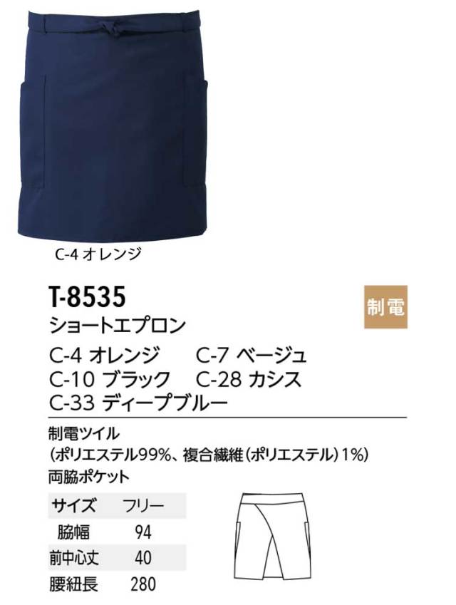 飲食サービス系ユニフォーム アルベ arbe チトセ chitose 兼用 ショートエプロン T-8535 通年
