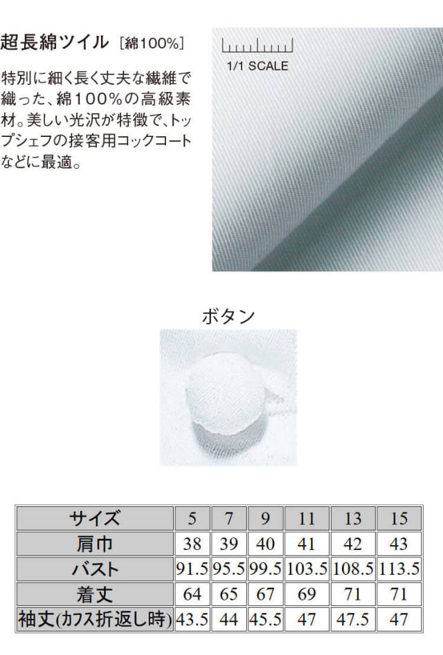 セブンユニフォームのドレスコックコートです。女性用です。上質な超長綿を用いた、高級店や特別なシーン向けの逸品。女性の体型に合わせて、女性向けにデザインされたコックコートです。特別に細く長く丈夫な繊維で織った、綿100%の高級素材。美しい光沢が特徴で、トップシェフの接客用コックコートなどに最適な素材を使用しています。ホテル、レストラン、和食店、料亭、旅館、居酒屋、和カフェ、お土産店、ベーカリー、スイーツ店などどんな職種にも対応できるシャツです。