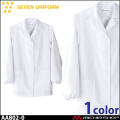 セブンユニフォームの白衣コートです。女性用です。形態安定に優れたタフ素材を、特殊プレスや耐久縫製でさらに強力に。長時間の酷使や洗濯にも、折り目やプリーツは美しさをキープ。この驚異の形態安定性と耐久力を、是非ともお仕事にお役立てください。ホテル、レストラン、洋食店、和食店、調理師、料亭、旅館、居酒屋、和カフェ、お土産店、ベーカリー、スイーツ店などどんな職種にも対応できる白衣です。