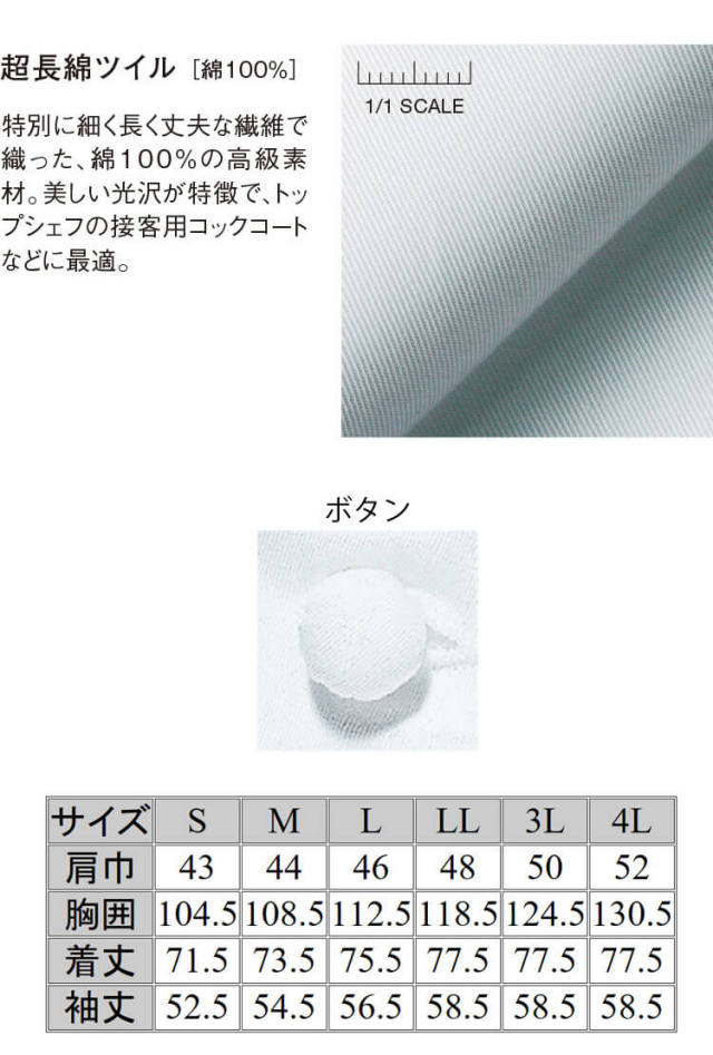 セブンユニフォームのドレスコックコートです。男女兼用です。上質な超長綿を用いた、高級店や特別なシーン向けの逸品。衿まわりや肩、袖のコードパイピングが格調高い雰囲気です。特別に細く長く丈夫な繊維で織った、綿100%の高級素材。美しい光沢が特徴で、トップシェフの接客用コックコートなどに最適な素材を使用しています。ホテル、レストラン、和食店、料亭、旅館、居酒屋、和カフェ、お土産店、ベーカリー、スイーツ店などどんな職種にも対応できるシャツです。