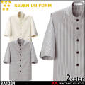 セブンユニフォームの五分袖スタンドカラーコートです。男女兼用です。抜群の形態安定性が特長のタフ素材を使用したシリーズです。洗濯ジワや型崩れが起こりにくく、ノープレスでも美しい仕上がり。風合いも柔らかで、色・柄・デザインも豊富に揃っています。工業洗濯に強くメンテナンスの負担を軽減します。洗濯によるシワや縮み、型崩れがほとんどなく、プリーツや折り目が消えることもありません。ノープレス、トンネルフィニッシャーのみでも美しく仕上がります。形態安定だけではないタフの多彩な機能性。優れた吸水性があり、長時間使用してもその機能は低下しません。また洗濯の際は汚れが落ちやすく、染つきや色落ちもほとんどなし。毛玉や静電気も発生しません。ホテル、レストラン、洋食店、和食店、調理師、料亭、旅館、居酒屋、和カフェ、お土産店、ベーカリー、スイーツ店などどんな職種にも対応できるシャツです。