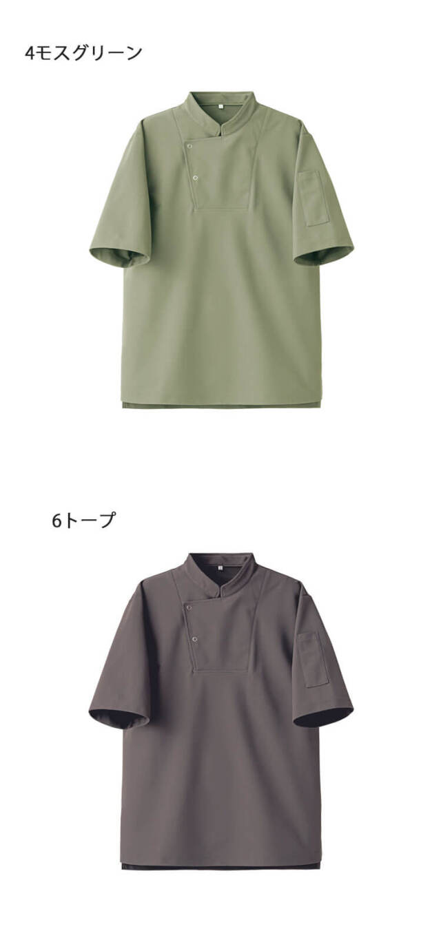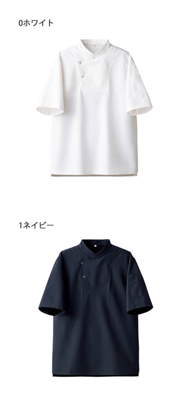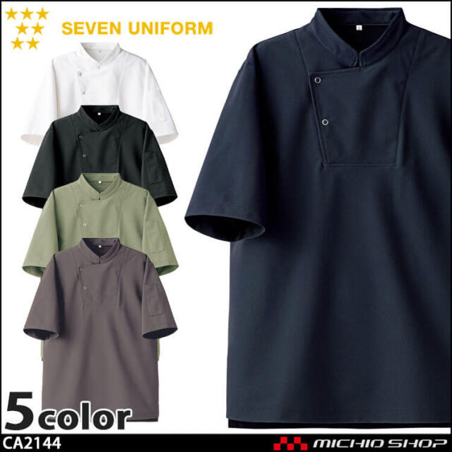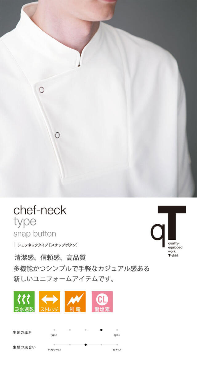 セブンユニフォームのニットコートです。シェフ型Tシャツ半袖です。品格とユニフォーム機能を併せ持つTシャツ「qTシリーズ」の1つです。清潔感、信頼感、高品質、多機能かつTシャツの特性であるシンプルで手軽なカジュアル感ある新しいユニフォームアイテムです。ホテル、レストラン、アミューズメント等のサービスの方へオススメです。ハイクオリティーTシャツを開発しました。Tシャツアイテムに注目したのはそのカジュアルさと誰もが抵抗なく着れる気軽さです。これを昇華させることでコンセプトに合うサービスユニフォームが出来るのではないかという思いからです。大きな特徴は3つです。カジュアルながらも高品質、かつ必要なユニフォーム機能があることです。働く人が品よく素敵に見えることです。商品がモダンデザインになっていて、かつ内装と調和することです。「qT/quality-equipped work T-shirt」シリーズは、Tシャツが持っているシンプルで手軽なカジュアル感を活かしつつ、ホテル等で必要とされる、質の高いおもてなしに対応できる品格と清潔感を持ち、それ単体でもユニフォームとして成立するシャツをコンセプトとしてデザインしました。 サイズ感や生地にもこだわり、ユニフォームクオリティで最良の着心地と機能性を備えた、新しいTシャツシリーズとなりました。