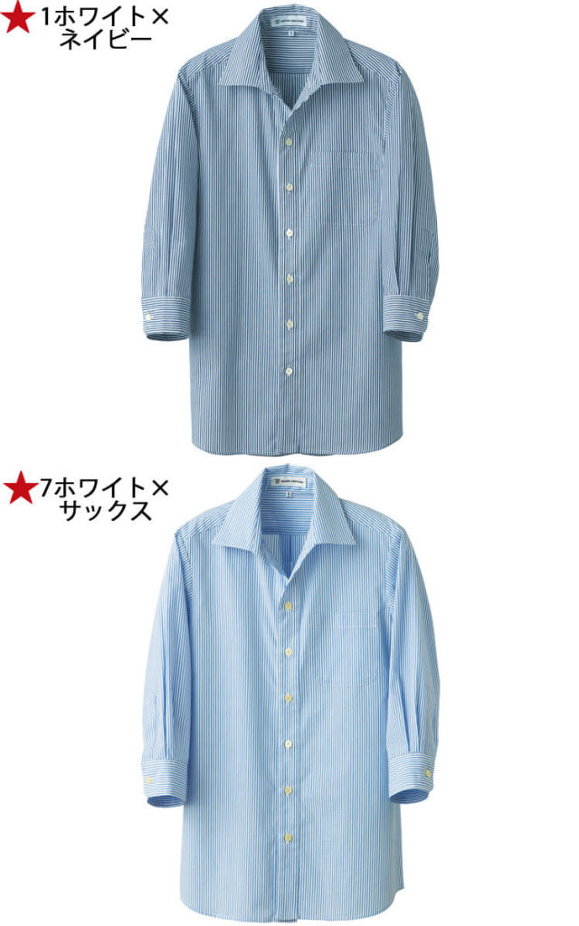 飲食サービス系ユニフォーム セブンユニフォーム 七分袖スキッパーカラーシャツ CH4462 男女兼用 ストライプ SEVEN UNIFORM 白洋社