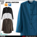 セブンユニフォームの八分袖ノーカラーシャツです。男女兼用です。弊社定番のシャツ生地に抗ウイルスの機能を追加したブラッシュアップ素材を使用しています。強度と安心感を両立しました。袖口にアンダーカバーを配したHACCP対応商品です。ノーカラー、ワーキングディティールを取り入れつつすっきりとした印象を与える8部袖シャツです。義務化される衛生管理手法「HACCP(Hazard Analysis and Critical Control Point)」は元来は食料品製造業界が主な対象ですが、今や食品関連業界に関わらずあらゆる場面で衛生対策に関するお客様の目が厳しくなり、今後さらに衛生面に配慮したユニフォームが求められるのではないかと考え、対応商品を開発しました。新開発「CASUAL CLEAN(カジュアルクリーン)ユニフォーム」シリーズは、デパートの地下食料品店や街の惣菜店、ベーカリーなどに向けた、軽装備のHACCP対応ユニフォームです。